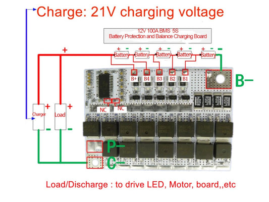 Cargador y balanceador BMS Batería Li-ión Lipo 18650 5S 100A