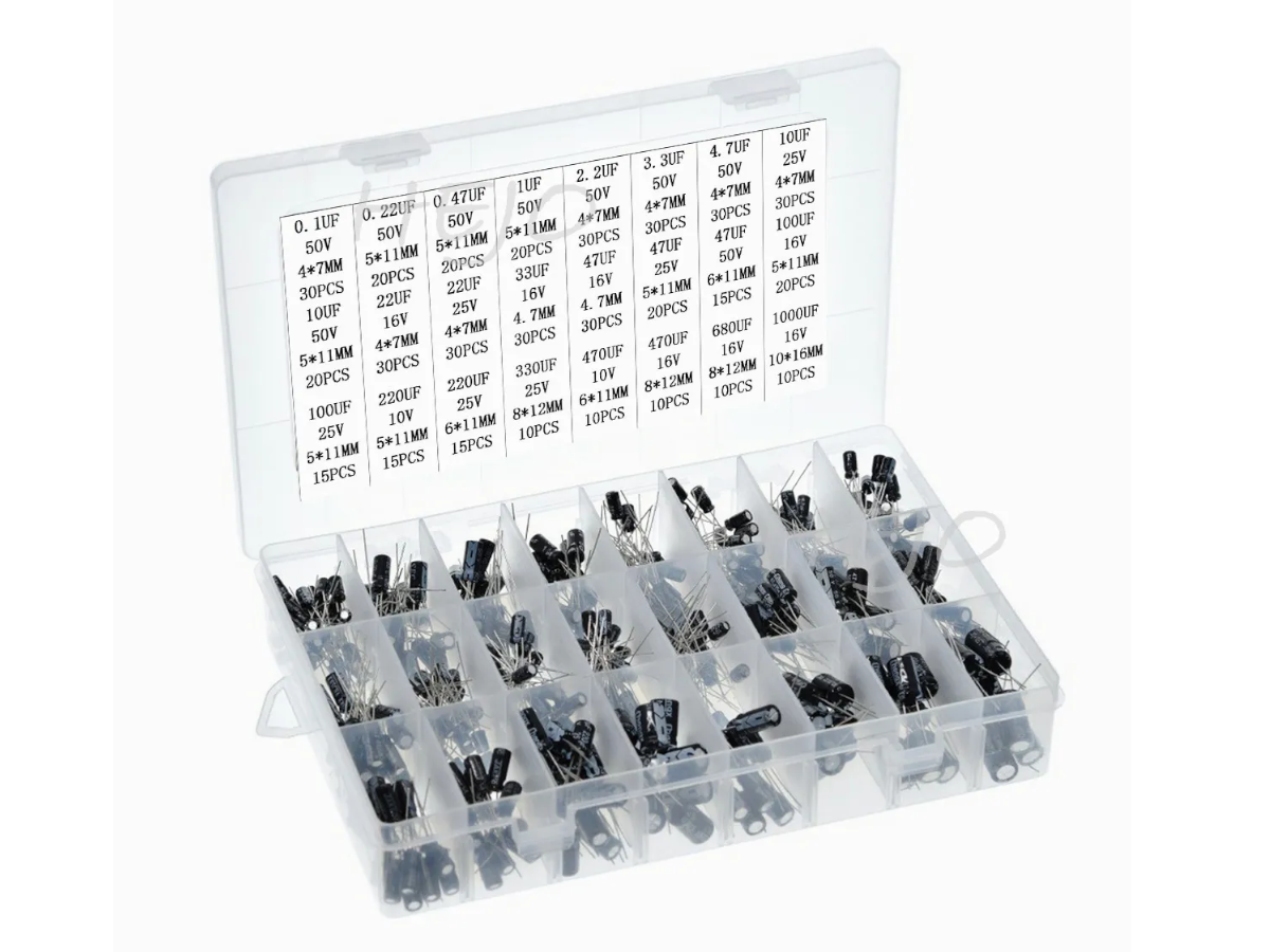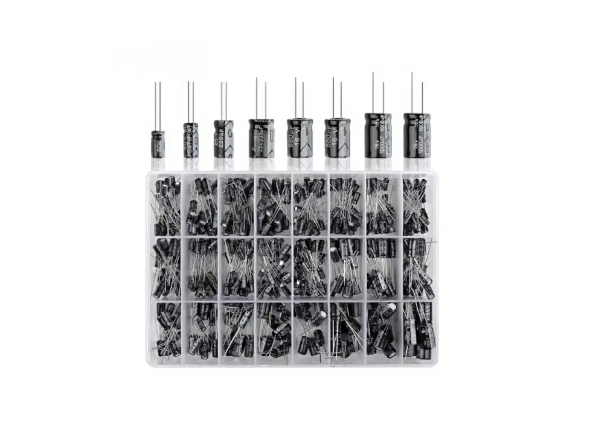 Incluye 500 capacitores electrolíticos distribuidos en múltiples valores de capacitancia y voltaje.