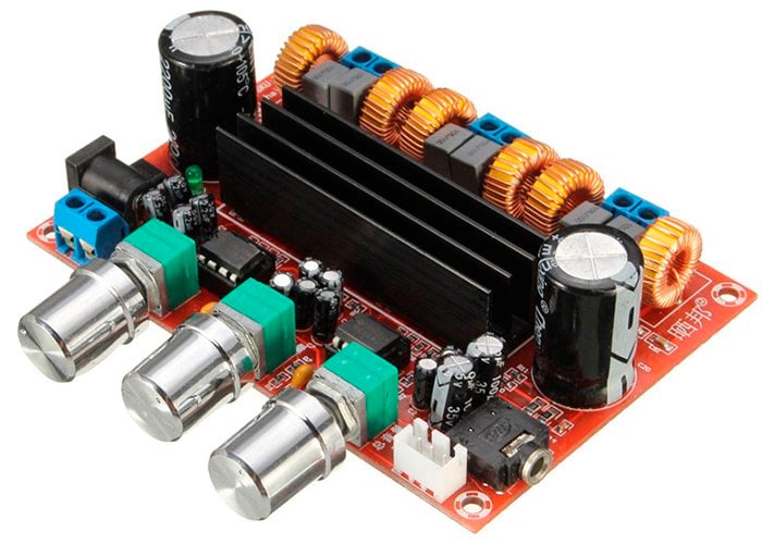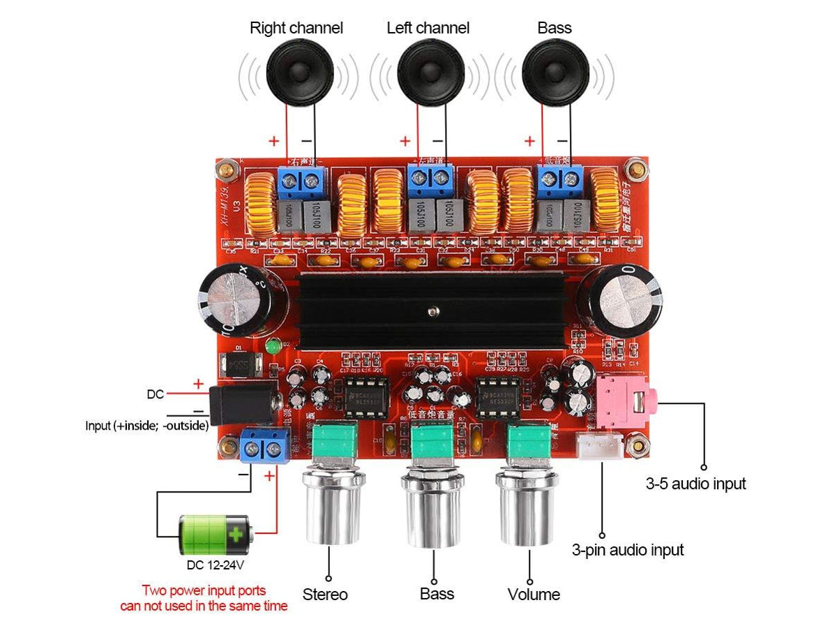 Este módulo amplificador de audio 2.1 está basado en dos potentes chips TPA3116D2, ofreciendo una salida estéreo de 50W por canal y un canal dedicado de 100W para subwoofer. Su diseño de Clase D garantiza una alta eficiencia y un rendimiento sonoro claro en un formato compacto. Incorpora potenciómetros para ajustar el volumen general, los graves y los agudos, permitiendo una personalización sencilla del sonido. Cuenta con una entrada de audio jack de 3.5 mm y terminales de tornillo para una conexión segura de la alimentación y los altavoces.