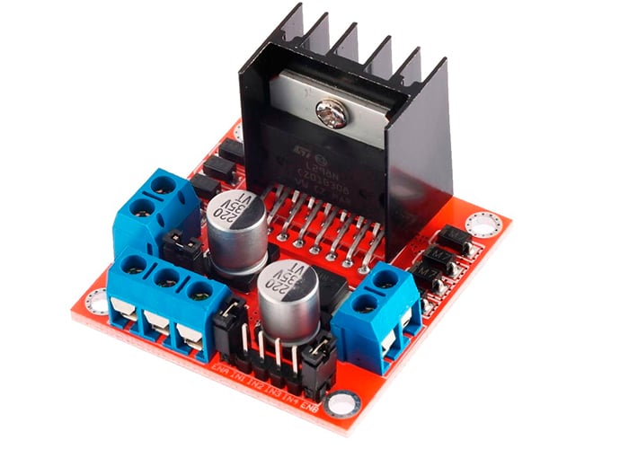 Permite controlar tanto el sentido de giro como la velocidad de los motores a través de señales TTL, y cuenta con un regulador integrado que puede usarse para alimentar la parte lógica desde una fuente de 12 V.
