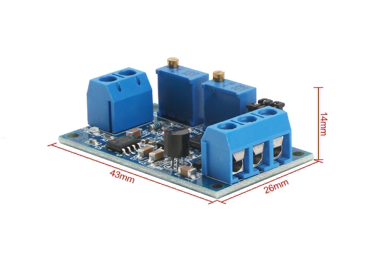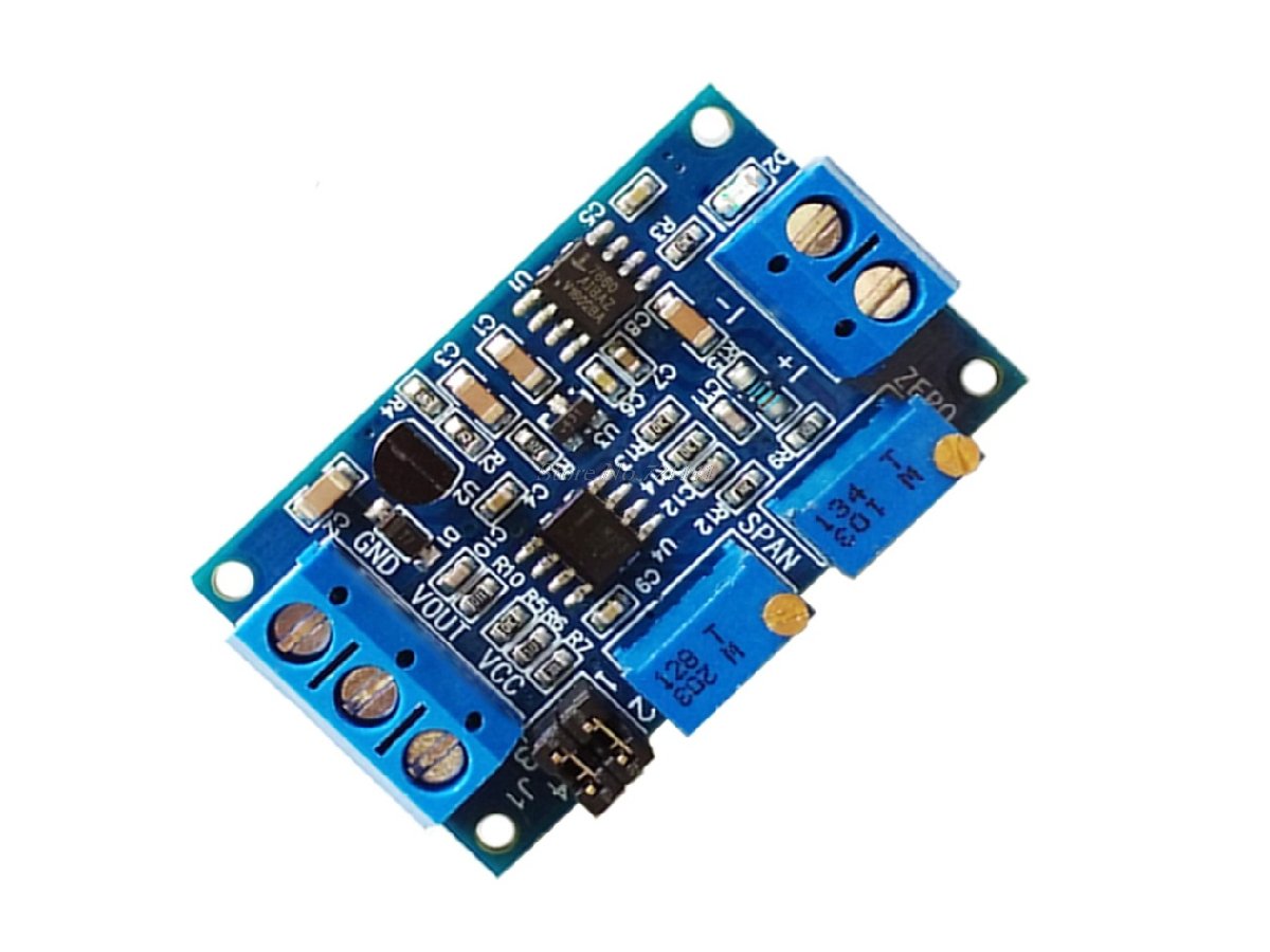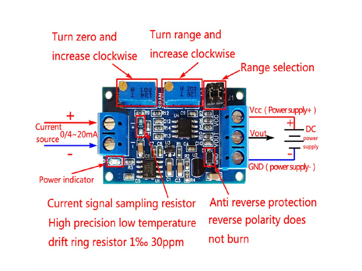 El módulo posee conectores tipo borneras. En su entrada soporta corrientes de 0 – 20 mA y 4 – 20 mA, comúnmente usado en la industria, mientras que en la salida entrega tensiones seleccionables 0 – 3.3 VDC, 0 – 5 VDC, 0 – 10 VDC, proporcional a la entrada. Posee potenciómetros para ajustar el valor Cero y calibrar la tensión de salida máxima según el rango seleccionado.
